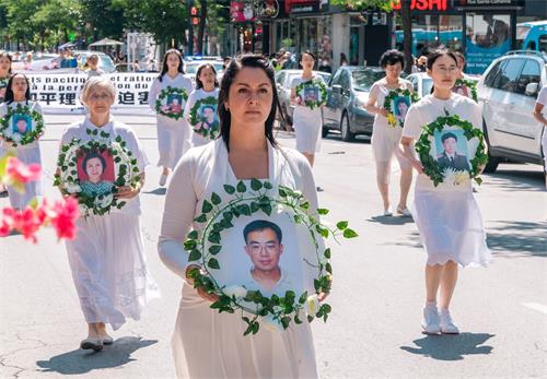 图1:2022年7月9日,加拿大魁北克部份法轮功学员在蒙特利尔市中心举行反迫害23周年大游行。