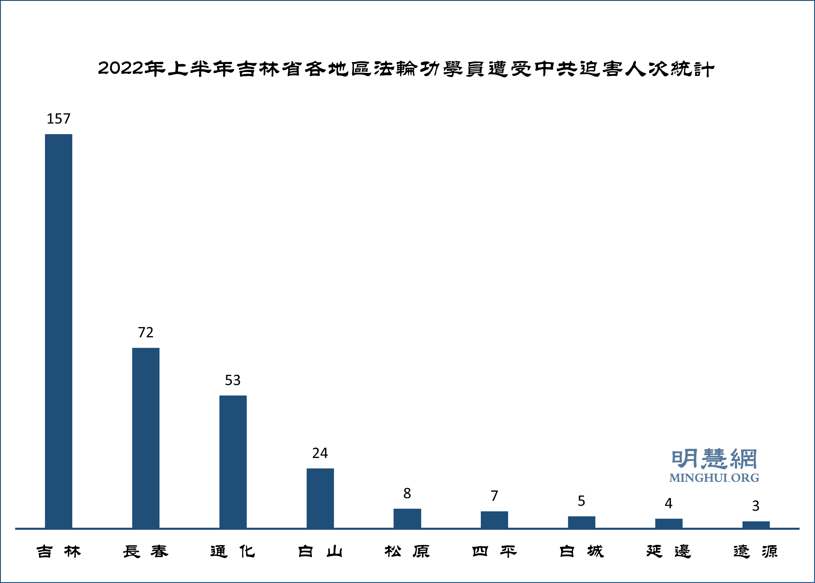 根据二零二二年上半年明慧网曝光的吉林省法轮功学员遭迫害案例所做的不完全统计,吉林省九个地区法轮功学员遭各种迫害333人次。