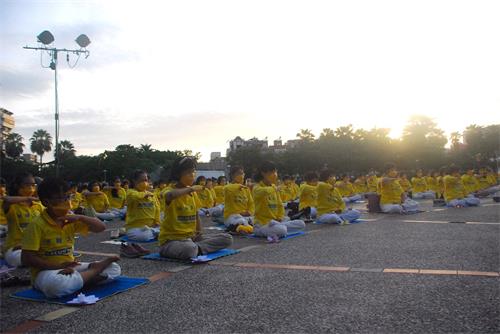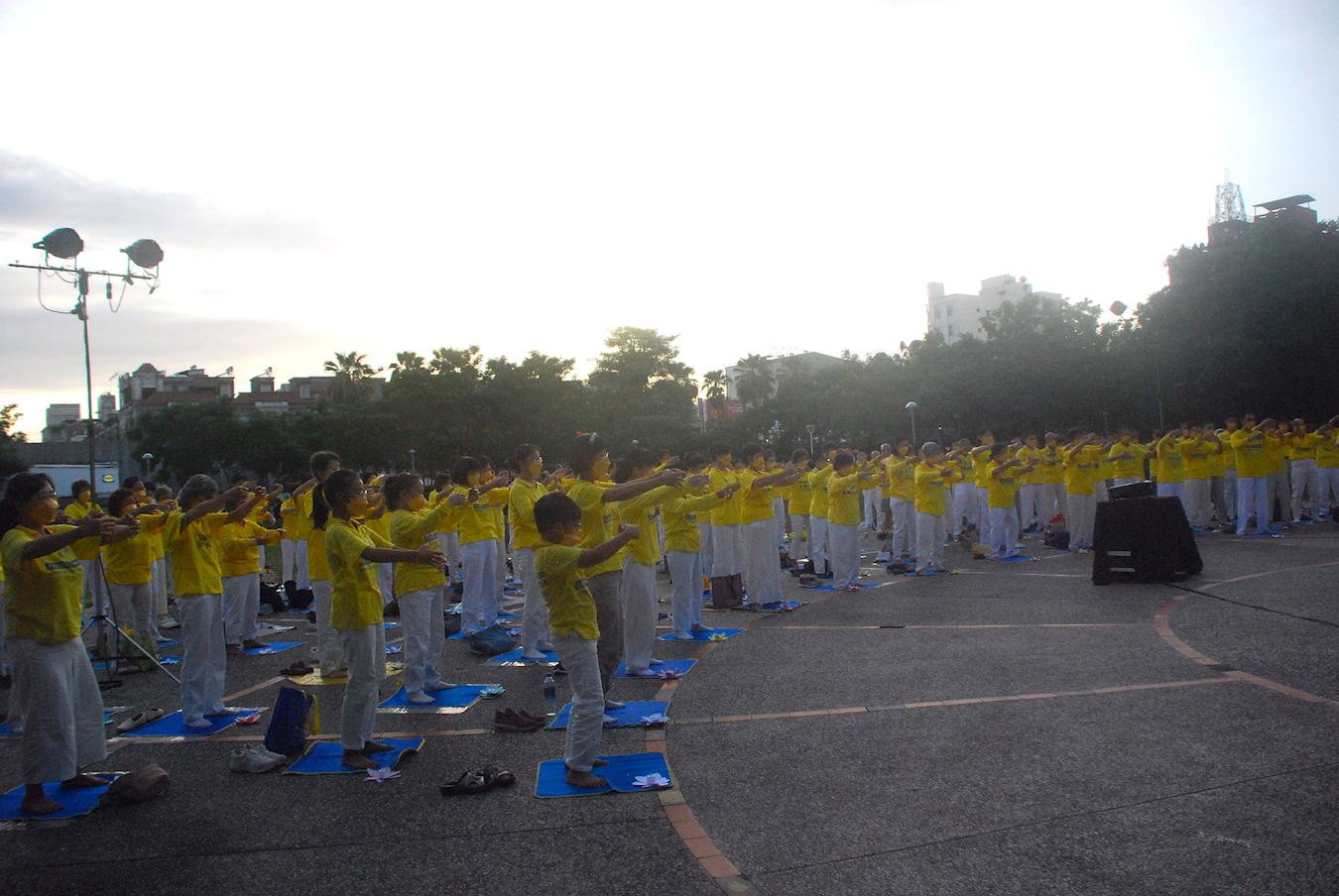 图1~3:嘉义地区部份法轮功学员在嘉义市文化公园中央舞台集体炼功,并举行烛光悼念活动