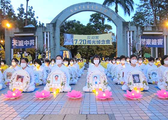 台湾屏东部份法轮功学员七月十六日在屏东市千禧公园举行烛光夜悼集会,悼念因坚持信仰而被中共迫害致死的中国大陆同修。