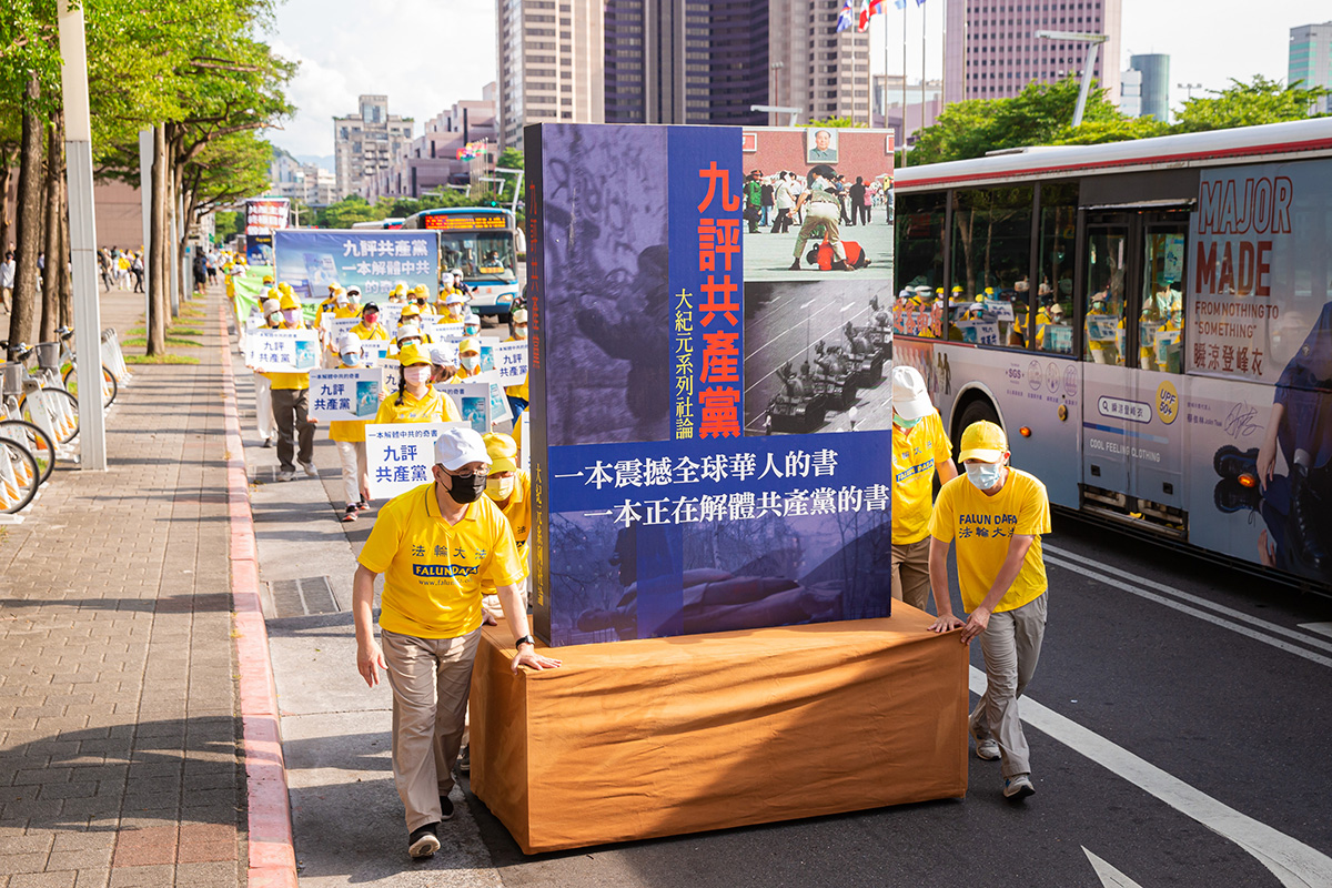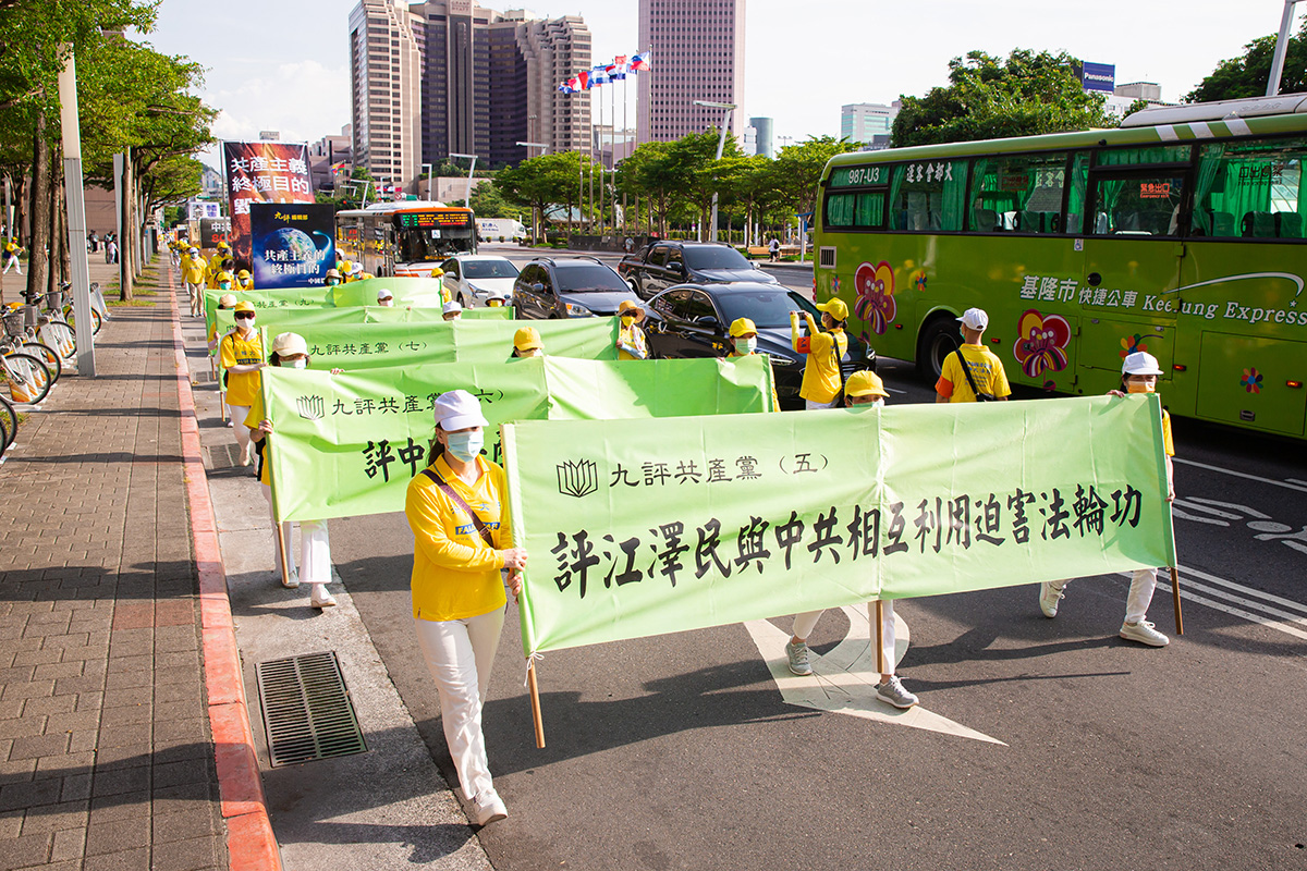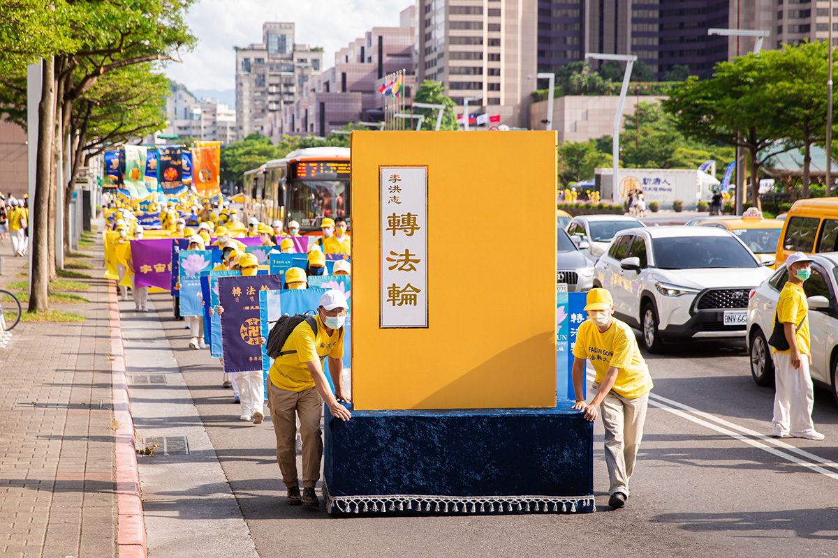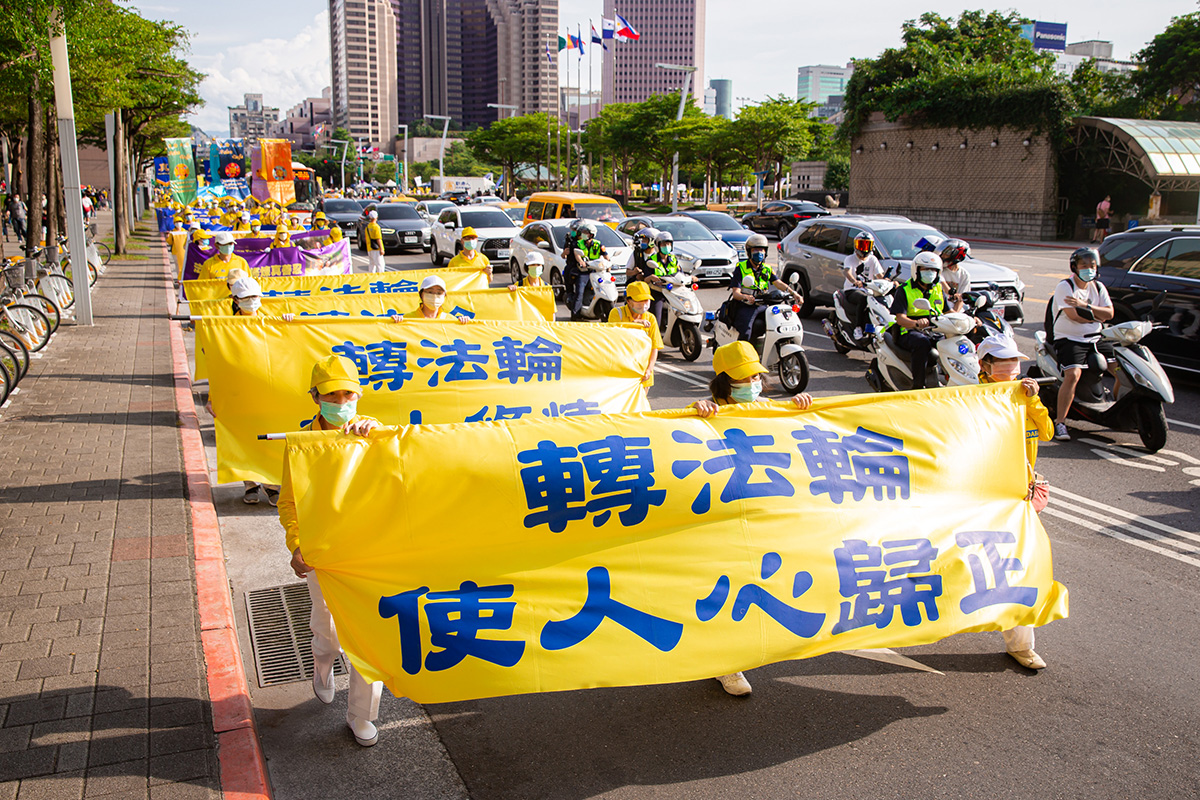 二零二二年七月十六日,台北部分法轮功学员约一千多位学员顶着高温在台北街头举行七・二零反迫害大游行,游行队伍从台北市政府市民广场出发,分三大方阵——大法弘传、千古奇冤及结束迫害,行经热闹信义计划区四周回到广场前,全程约1.8公里。