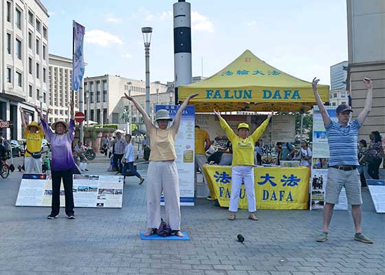七月十六日,部份比利时学员在布鲁塞尔欧洲广场举办信息日,向民众介绍法轮大法,揭露中共持续二十三年的迫害。
