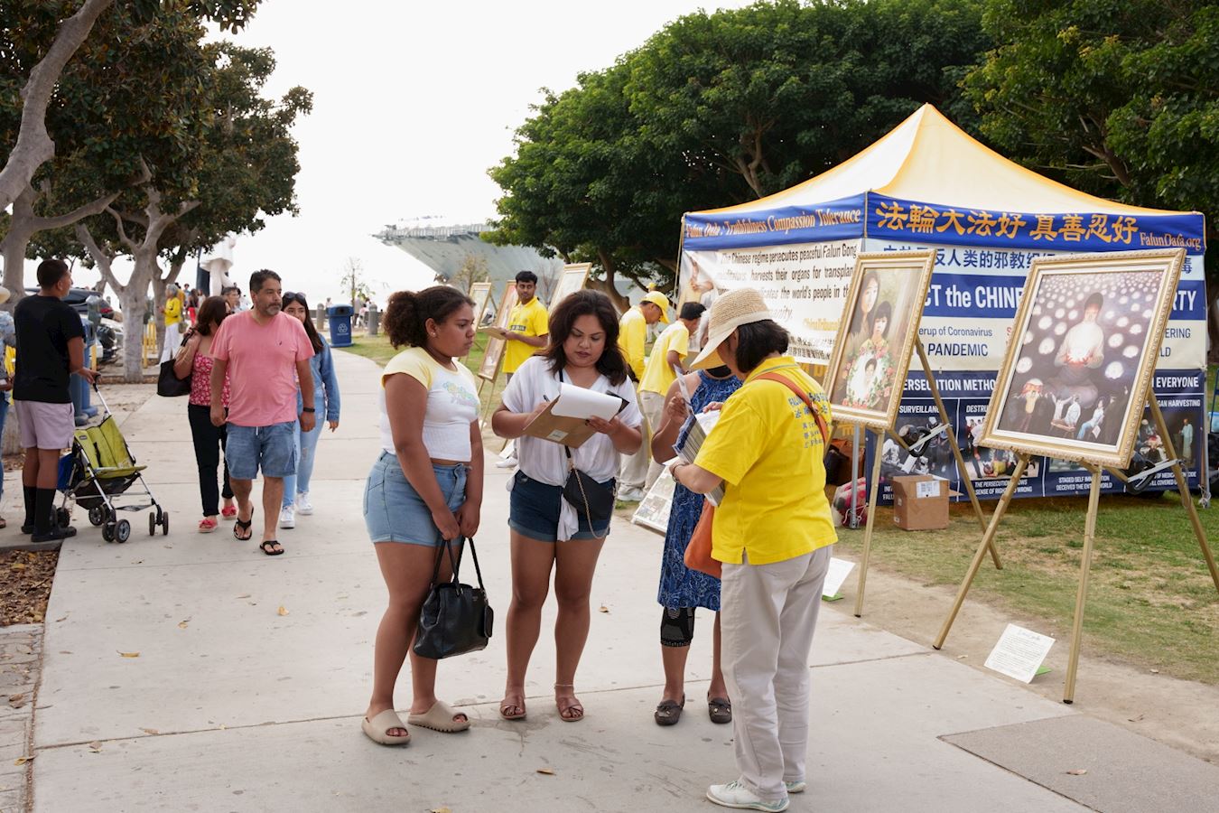 图1~2:2022年7月16日,加州圣地亚哥法轮功学员在当地中途岛航空母舰博物馆景点公园举行集体炼功