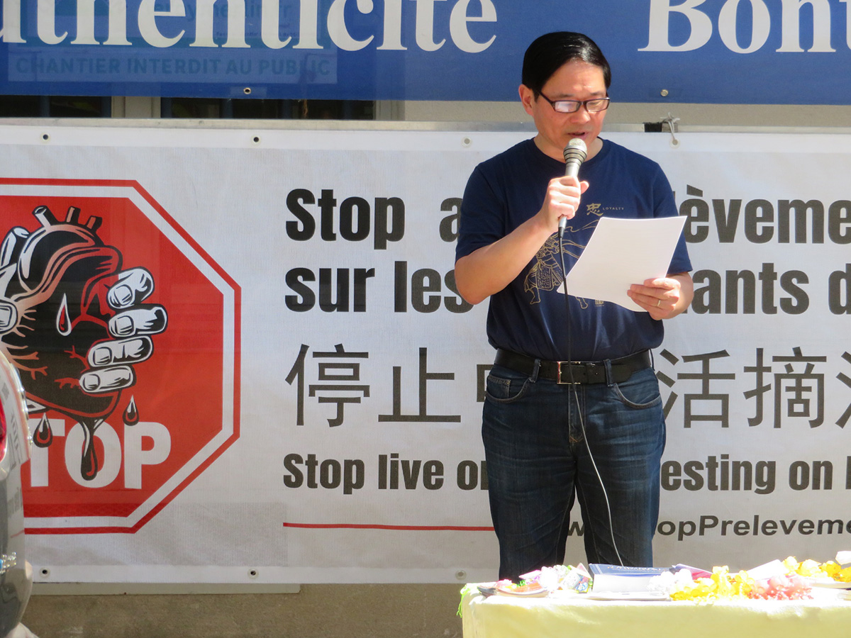 医生反对活摘器官组织(DAFOH)法国代表金(King)先生在集会上发表演说,揭露中共活摘器官行径,对法轮功学员犯下的反人类罪行。
