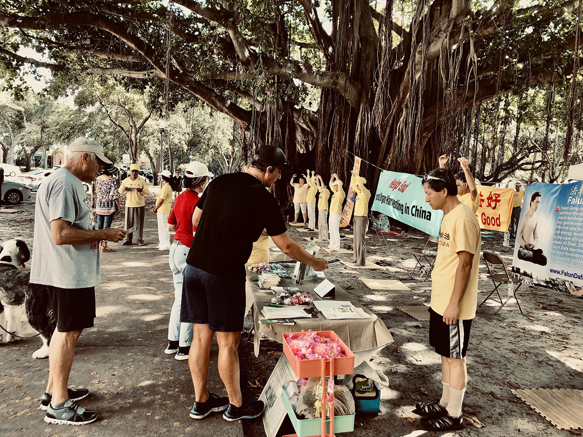 七月十六日上午,部分佛罗里达法轮功学员穿著黄色T恤衫,来到佛罗里达西海岸的滨海城市圣彼得堡市中心的公园。他们在优美的音乐中展示舒缓美好的功法,同时向过往行人讲述大法的美好,以及中共对这一修炼团体毫无人性地残酷迫害,呼吁解体中共,立即停止迫害法轮功。