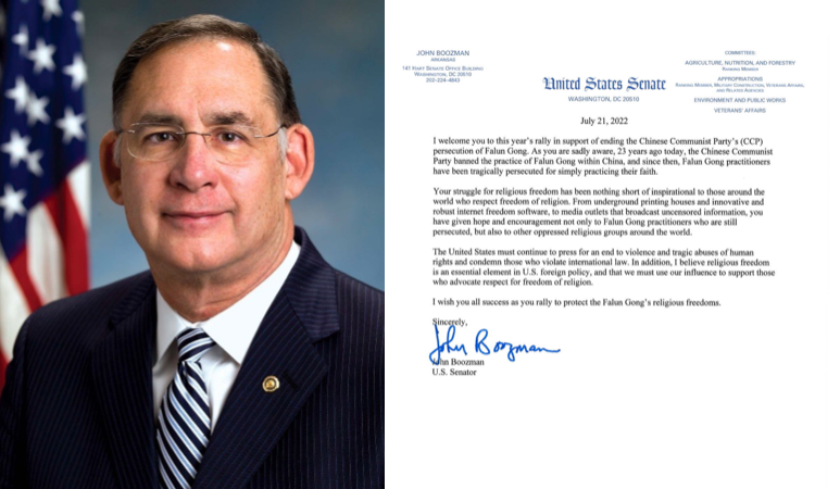图4:阿肯色州联邦参议员约翰·布兹曼在支持信中说:“美国必须继续施压以结束这场残忍的迫害。”