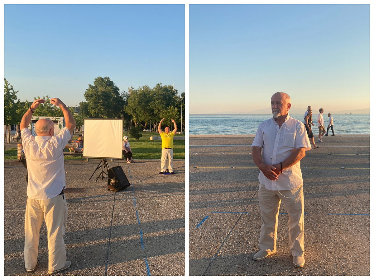 ![]() 图6~7:法轮功学员在雅典比雷埃夫斯港展示功法,并向路人传播法轮功真相 |
