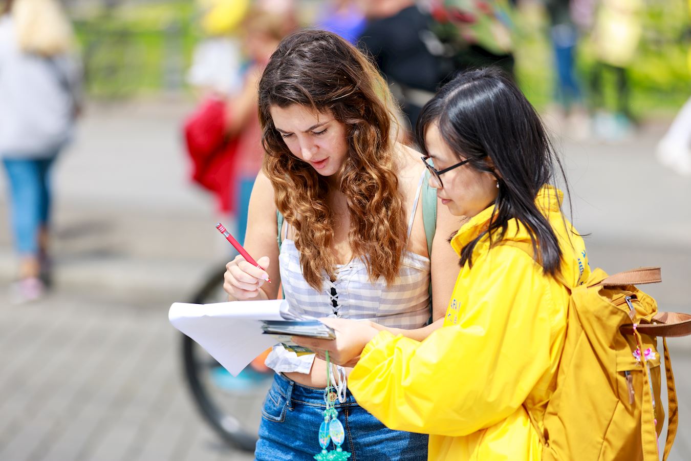 来自美国的工程师(James Erasco)和太太Katrina Loke来到签名台前,签名支持法轮功学员。