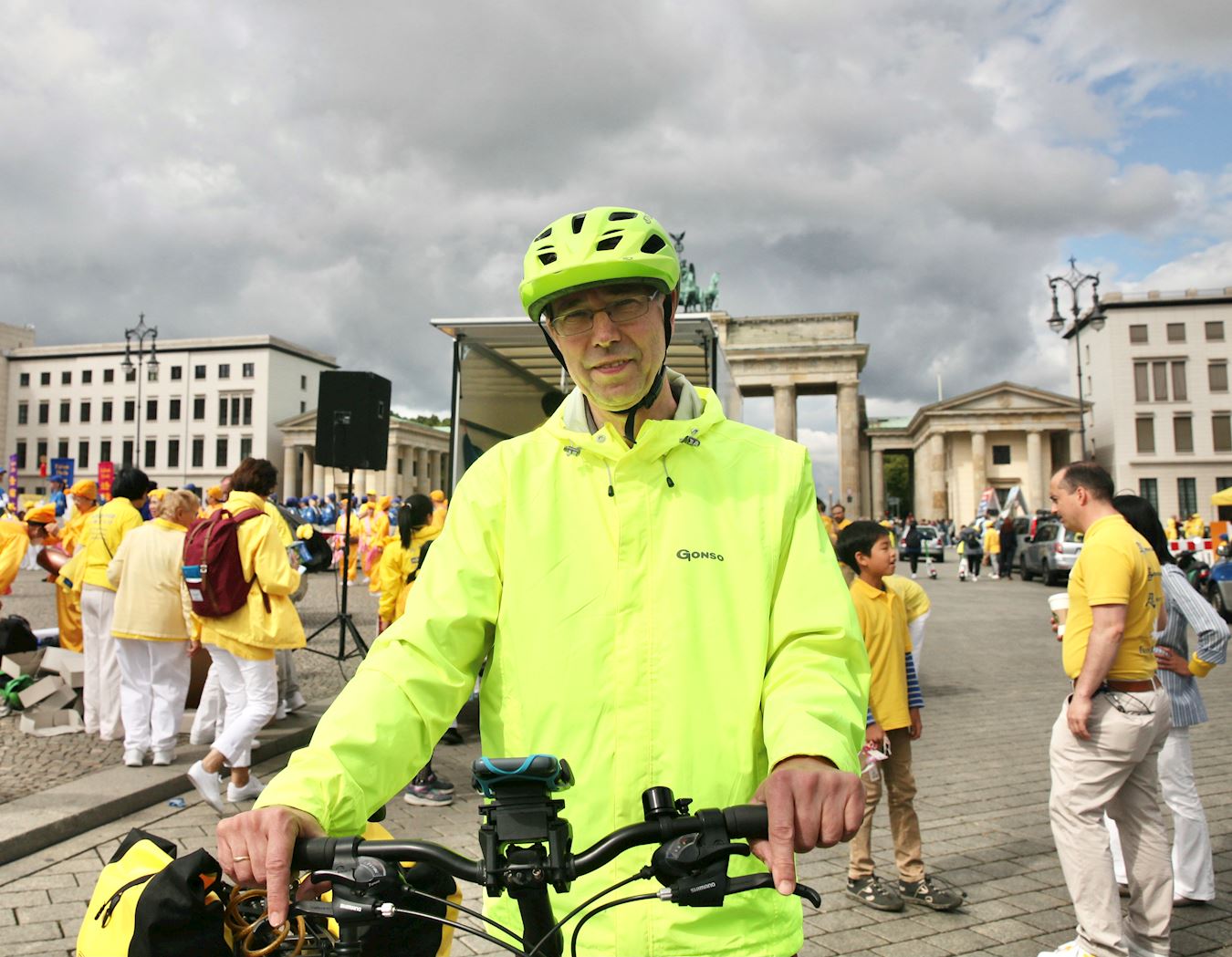 电气工程师霍夫柔格(Markus Hoffrogge)和太太在广场上寻找签名表格,并签了名。他说自己有位朋友修炼法轮功,曾经给他讲述过法轮功学员反迫害的事。他们来自德国西部,正在进行自行车旅游,碰巧遇到了法轮功学员的集会。