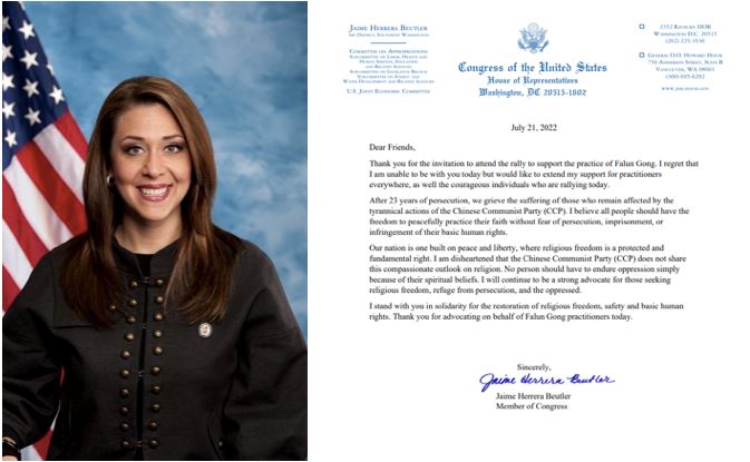 图3:代表华盛顿州第三选区的共和党籍联邦众议员海梅·贝特勒(Jaime Herrera Beutler)致信,表达对全世界各地的法轮功修炼者及参加集会的勇士们的支持。