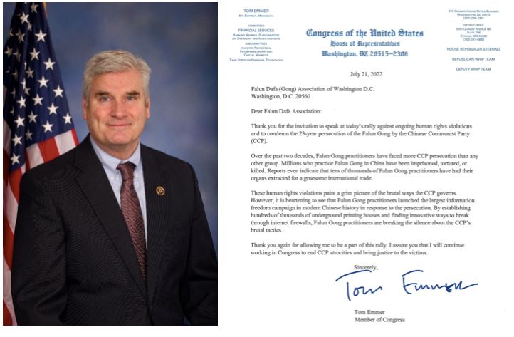 明尼苏达州第六选区众议员汤姆·埃默(Tom Emmer)在信中首先谴责了中共对法轮功学员长达二十三年的迫害。