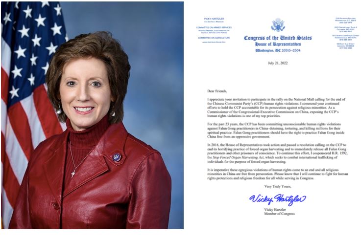 联邦众议员维姬·哈兹勒(Vicky Hartzler)是美国国会中国事务执行委员会专员,她在信中表示,揭露中共的侵犯人权行径是她的首要任务之一。