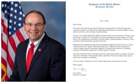 国会议员汤姆·提芬尼(Tom Tiffany)在支持信中说:“我对北京对法轮功学员的迫害记录深感忧虑。中共的的迫害并不止步于法轮功,近几年来已经扩展到新疆维吾尔人,西藏佛教徒,基督徒,艺术家,记者,政治异见人士和他们的家属。”