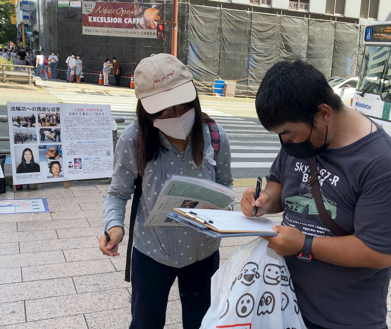 有位来自韩国的大学生听完学员的说明后,用流利的日文说:“我是韩国人,正在福冈的一所大学读书。我没想到中国竟然发生如此严重的人权迫害,太可怕了。我的签名能够成为一份正义的力量的话,我就愿意签。”