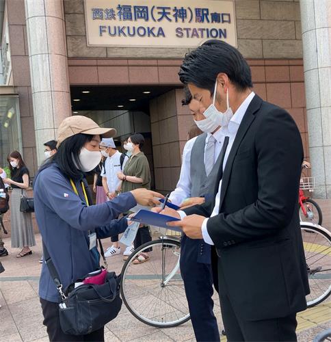 二零二二年七月十六日和十七日,熊本法轮功学员来到了福冈市商店街天神,呼吁日本民众关注中共对法轮功长达23年的人权迫害,并在“控告江泽民刑事举报联署活动”举报书上签名声援共同制止这一惨绝人性的暴力专制。
