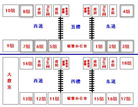 集训监区位于监狱一号楼的四楼和五楼两层楼,每层楼从中间楼梯上去后,东西各有一个走廊,称为“道子”——分别称“东道和西道”。