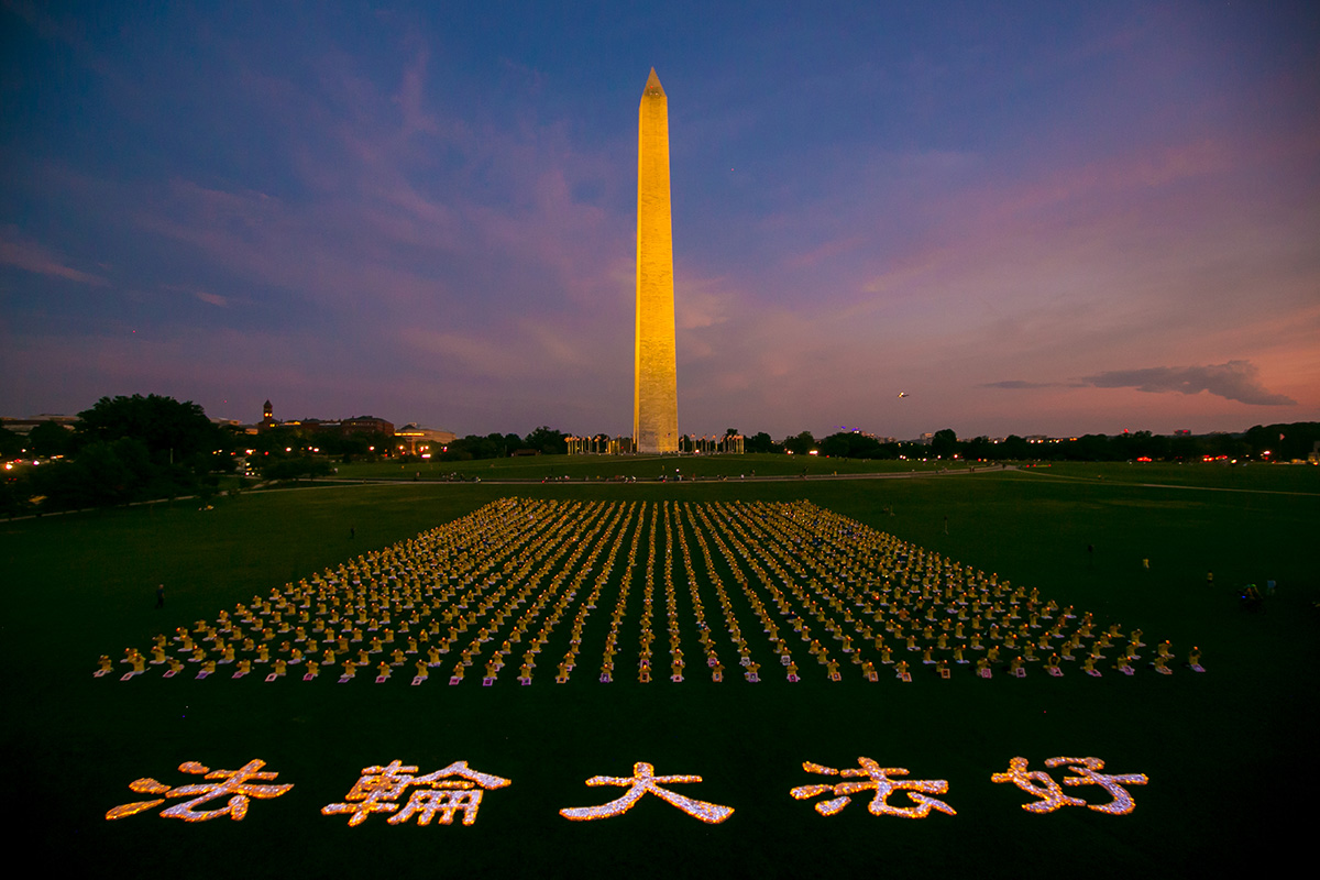 伴随夜幕降临,一千多名法轮功学员身着黄色上衣,举起手中烛光,静静坐在白宫对面的草坪上。一位游客说,她感到现场有“强大而平和”的能量。驻足拍照的游客中,许多人是第一次听说法轮功被迫害的情况,他们都对真、善、忍表示赞同,认为具有普世价值。