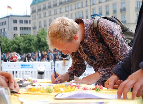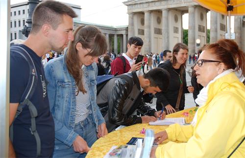 来自千里之外的康斯坦斯(Konstanze)三周前在科隆第一次听说中共活摘法轮功学员器官的罪行,当天来到柏林勃兰登堡门前,看到法轮功学员的活动,她签名表示支持法轮功学员:“我感到生命是宝贵的。活摘器官必须被制止,对人权的迫害必须被制止。”她也希望通过签名:“可以让更多的人知道中共罪行,尽早结束这场迫害。”