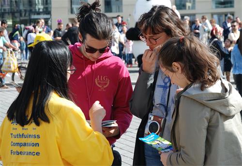同时法轮功学员也会随着优美的音乐展示舒缓的五套功法,与路人交谈,讲述自己修炼法轮大法后身心受益的故事,让人们了解大法的美好。面对来自世界各地的游客,学员们可以用中、德、英、法、俄五种语言流利清楚地讲述真相。