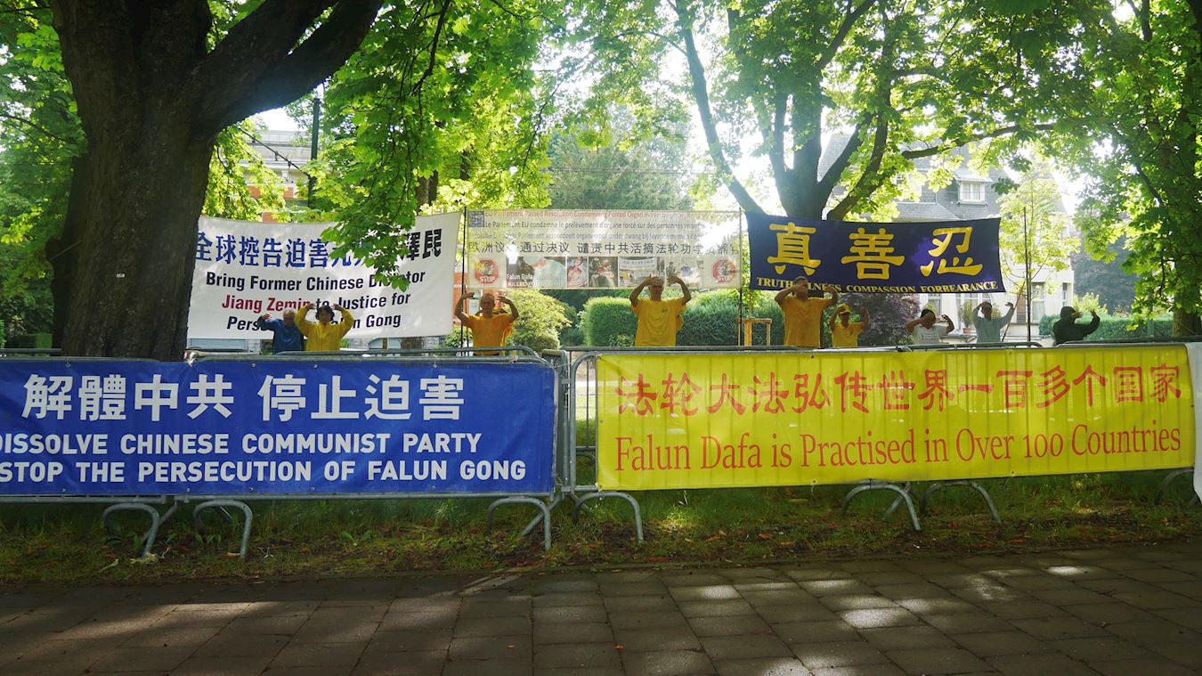 图1~2:二零二二年七月二十日,比利时部份法轮功学员在布鲁塞尔中领馆前举办活动,抗议持续二十三年的迫害