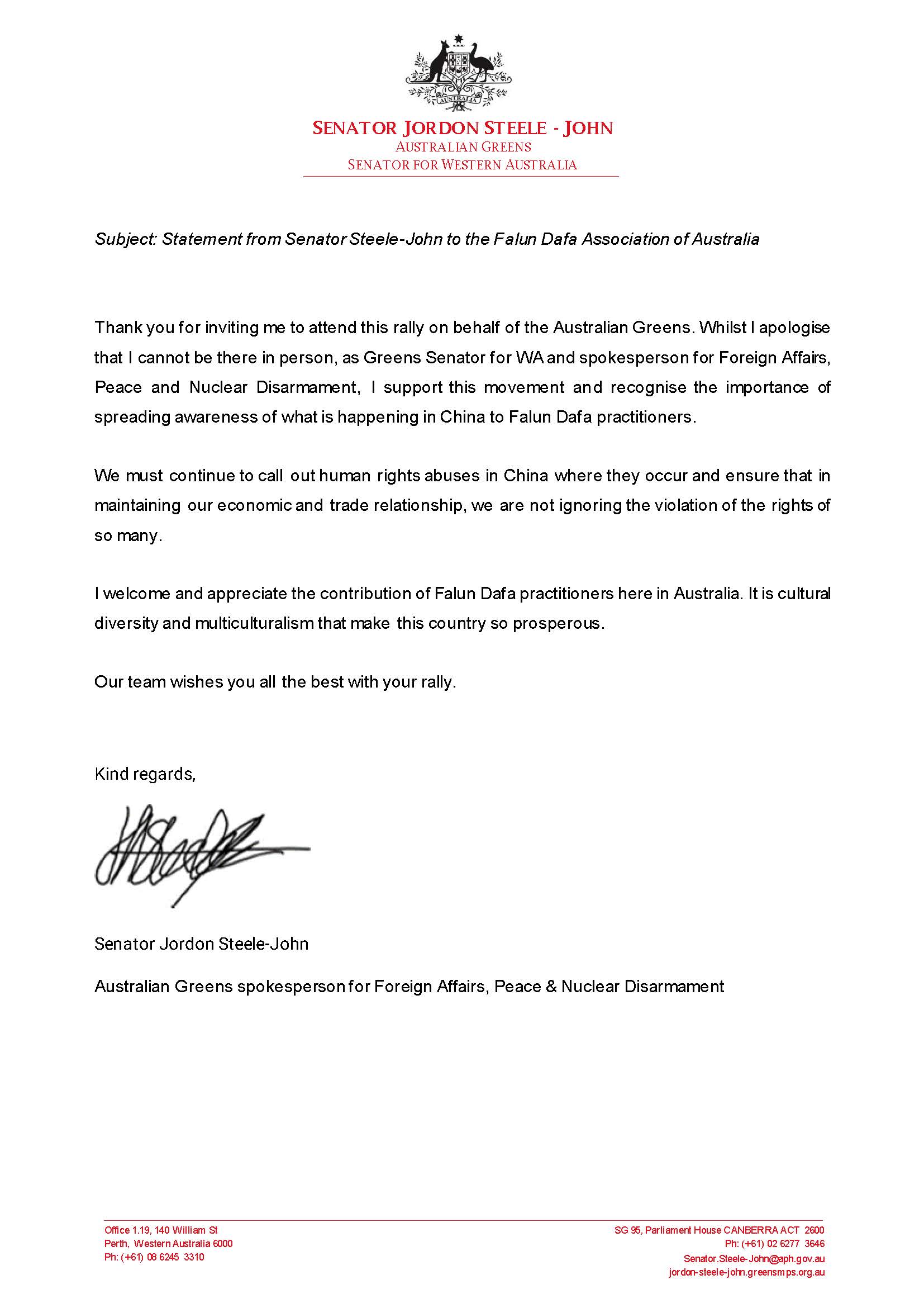 澳洲绿党外交、和平与核裁军发言人、西澳绿党参议员乔丹・斯蒂尔-约翰(Senator Jordon Steele-John, Australian Greens)向澳洲法轮大法学会发来了支持信。