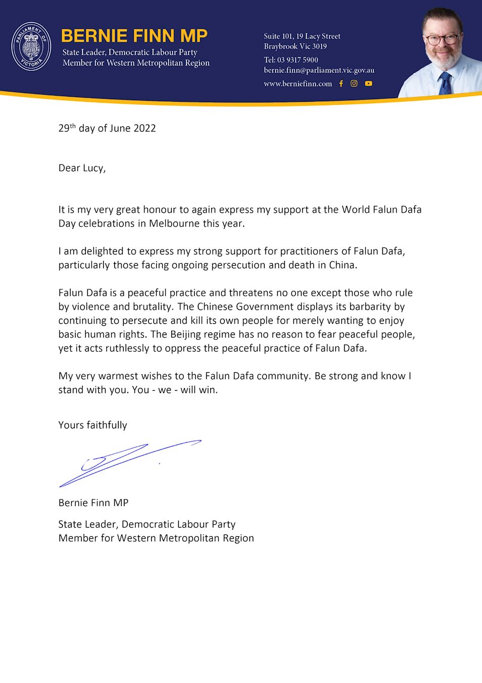 维州立法会议员、民主工党维州领袖伯尼·菲恩(Bernie Finn MP, Democratic Labour Party, Member of Victorian Legislative Council)在支持信中声援法轮功学员,希望对“特别是在中国国内一直面临着迫害与死亡的修炼者们,表达我的强烈支持”。