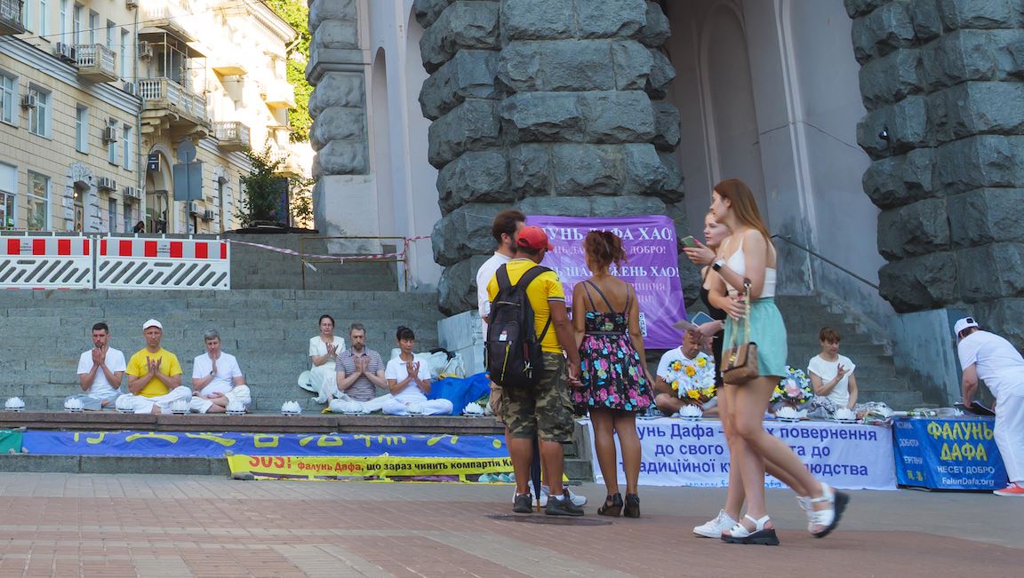 尽管乌克兰战争还在持续进行,不过基辅街头还是会有很多人。乌克兰东部和南部战区的很多国民迁移到了首都。他们中的很多人是第一次看到法轮功学员的活动,这使他们有机会了解大法。