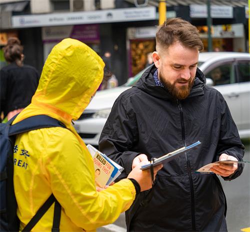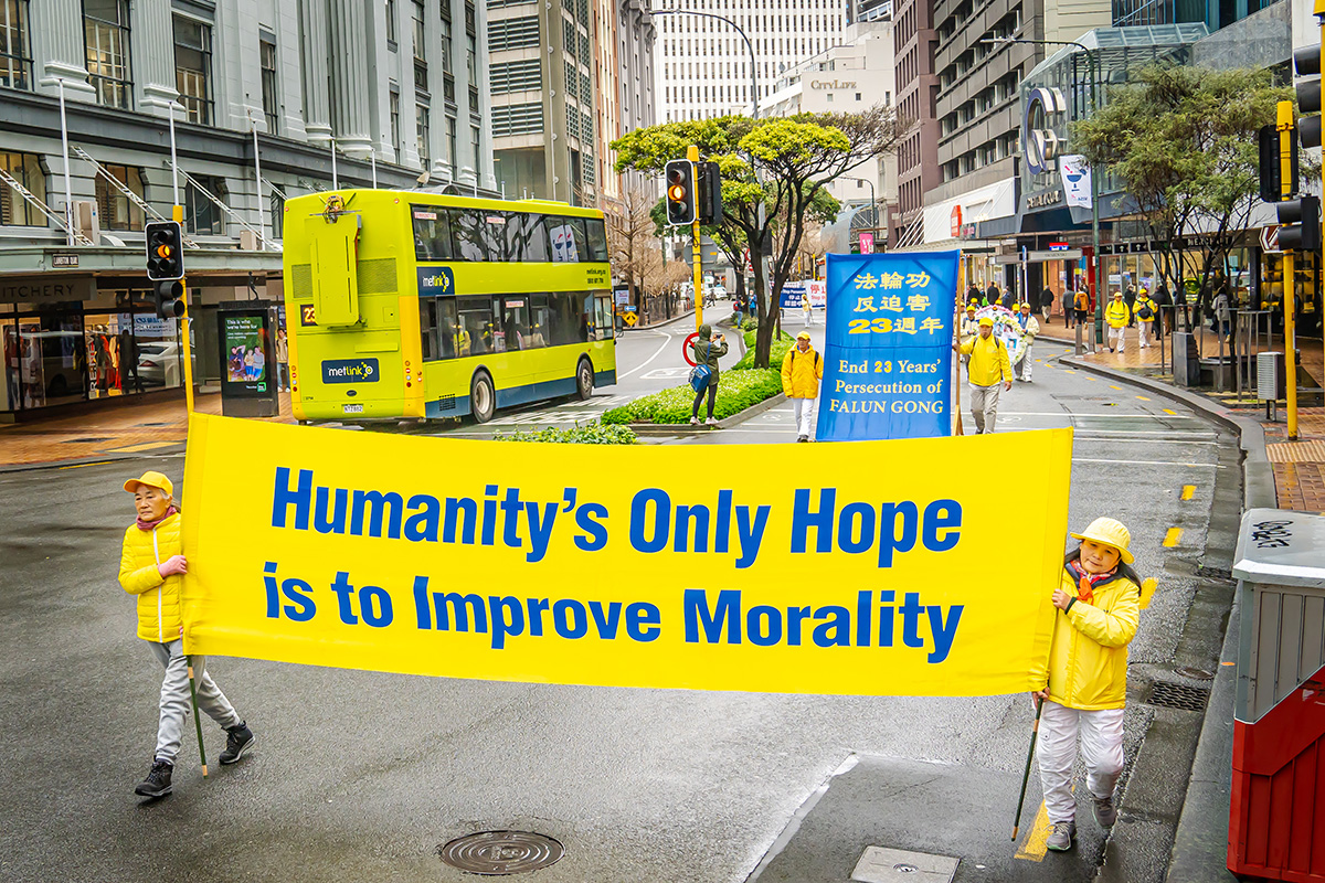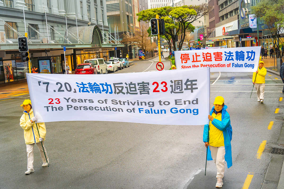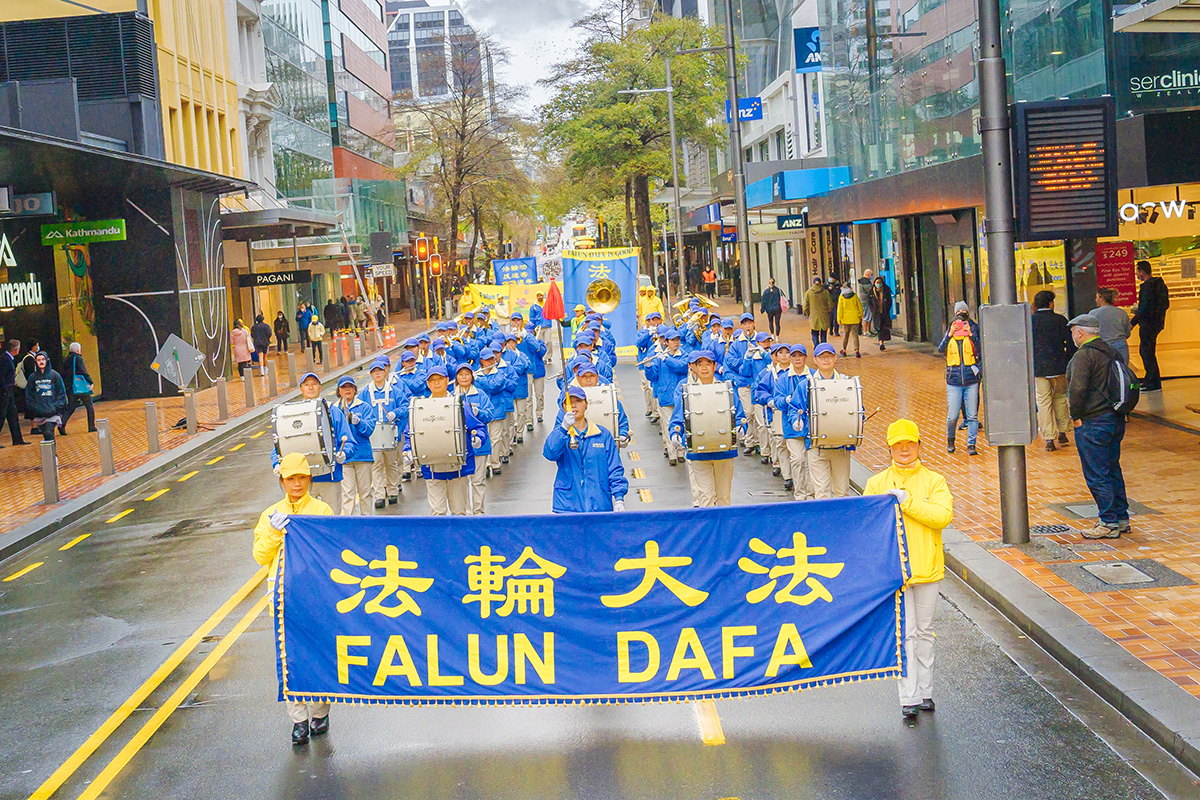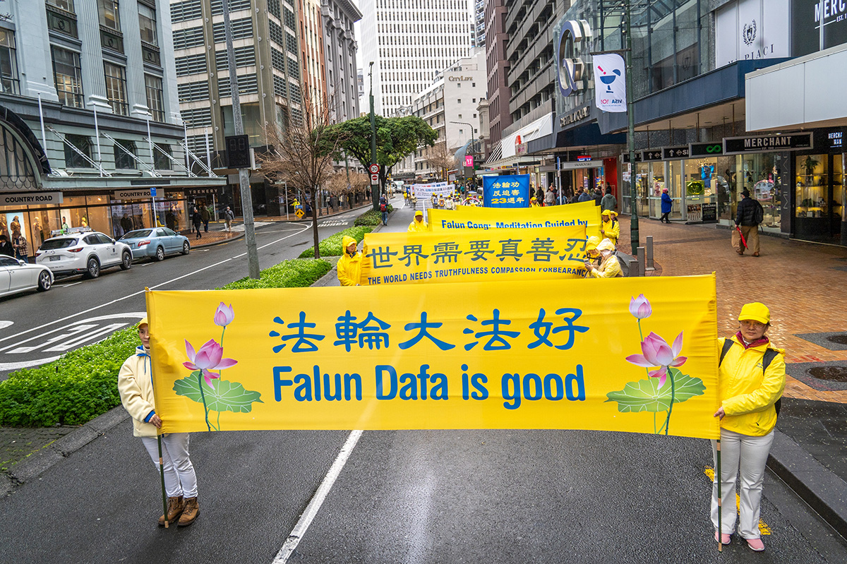 游行在上午十一点左右从市中心步行街古巴街(Cuba Street)出发,途径米德兰公园(Midland Park),然后抵达国会大厦。一路上,不少民众挥手致意和鼓掌支持,他们还主动来询问真相并签名支持法轮功学员反迫害。