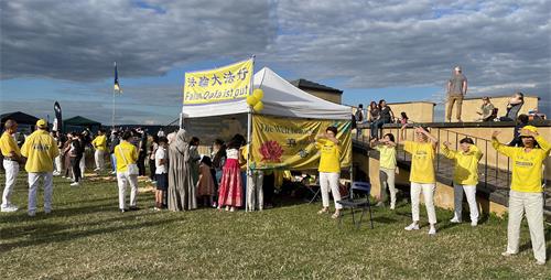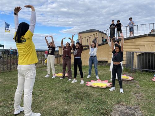 当法轮功在舞台上展示舒展,缓和的功法后,很多年轻人纷纷来到法轮功展台,开朗的询问是否可以学功。他们站成两排,模仿着法轮功学员的炼功动作,成了一个亮眼的景观。