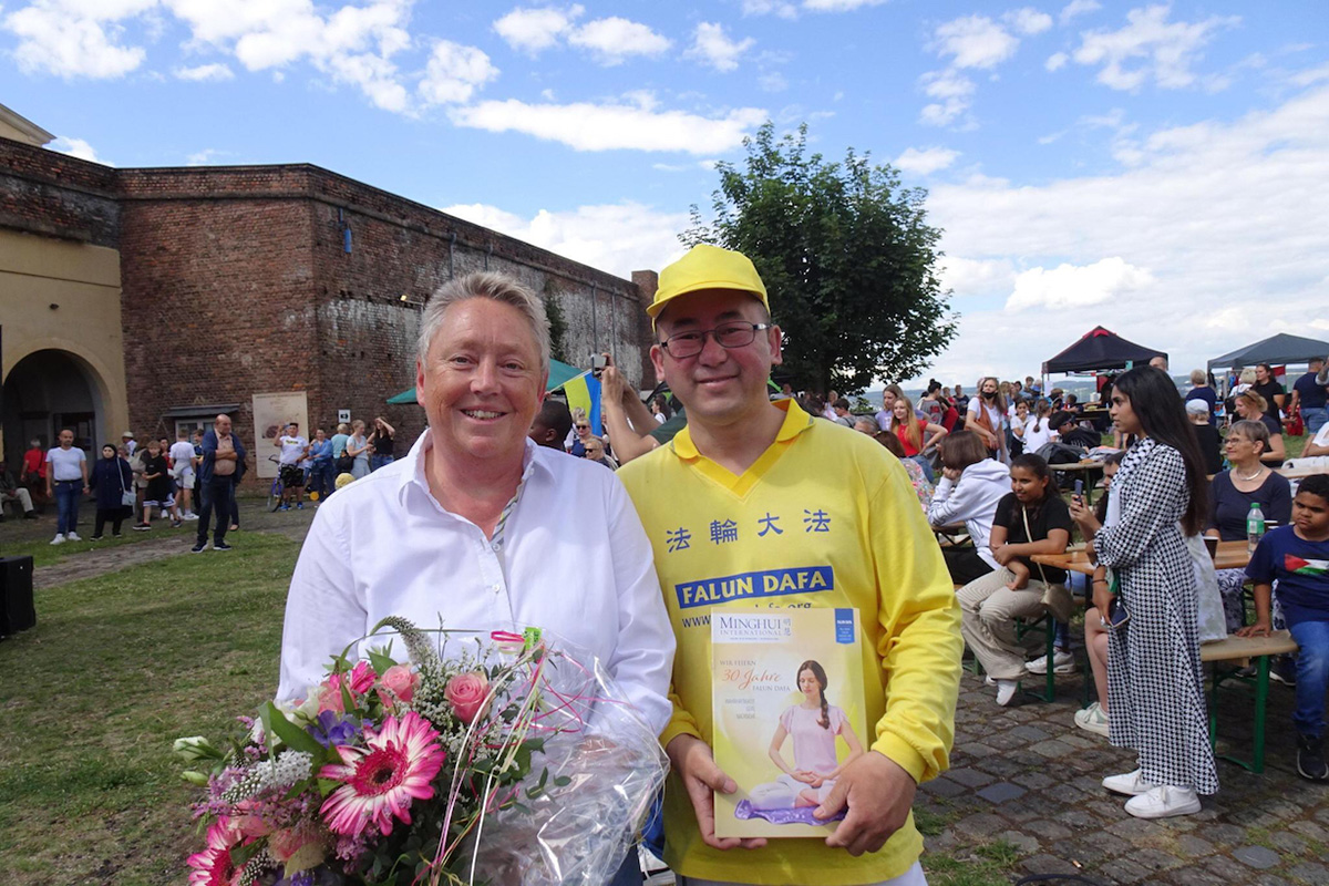市长乌尔里克·莫尔斯(Ulrike Mohrs)应法轮功学员邀请来到展位上,学员给了她一本介绍法轮功的明慧期刊,当学员们介绍法轮功所尊从的真、善、忍价值和中国的迫害时,她表示:“德国有基本法,我们为有资格获得保护的人士提供保护,这很好。无论是谁,从哪里来,来到我们这里,就会受到公正对待。我们当然支持人权。”