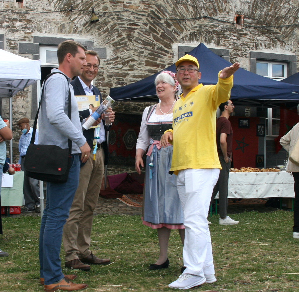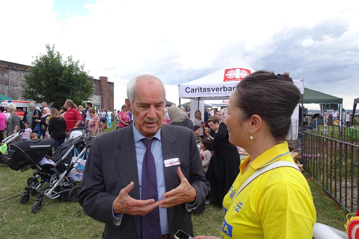 联邦国会议员奥斯特(Josef Oster)接受了法轮功的真相资料。法轮功学员郭先生对奥斯特议员讲述了自己在中国被中共非法关押和迫害的经历。同时也讲述了来到德国后他如何努力学习德语并在当地一所医院教法轮功的经历,他因为修炼法轮功身心受益,将自己的经验分享给了三十多人,让他们也一起学炼法轮功。