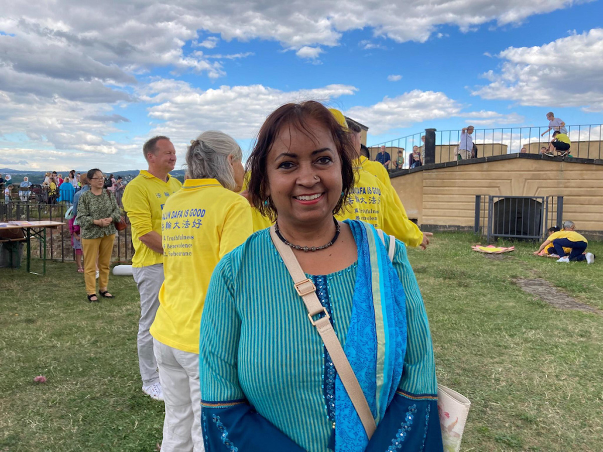 瑜伽老师克莱默尔女士(Shobha Gaur-Krämer)从远处就看到了学员们穿着亮丽的黄色服装,感受到法轮功学员的仁爱,来到了展台。她表示:“真、善、忍十分重要,与金钱、紧张和压力正相反,在当今很重要。我很感激你们今天花时间来到这里,展示给世界这些价值。”她经常看各种报道,也了解中共迫害法轮功学员和活摘器官,她认为:“严厉的统治不是长久的解决办法,而应该通过仁爱。”