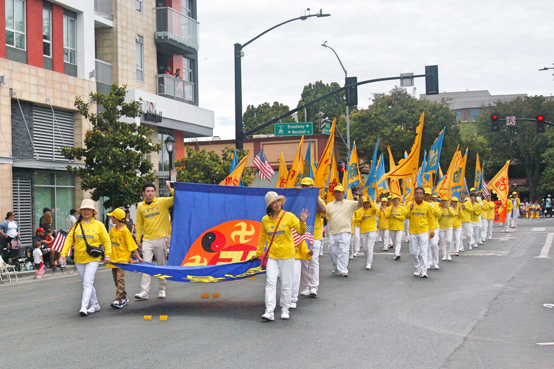 红木城市位于旧金山湾区中半岛,独立日游行从一九三九年就开始了,是北加州最大且历史最悠久的游行活动。当日,法轮功学员在红木城独立日的游行方队由法轮功功法演示队、腰鼓队、旌旗队和花车组成。走在最前面的是法轮功学员的炼功队,他们向观众展示法轮功的五套功法。一路上,两旁的观众看到学员的队伍不断的鼓掌喝彩。