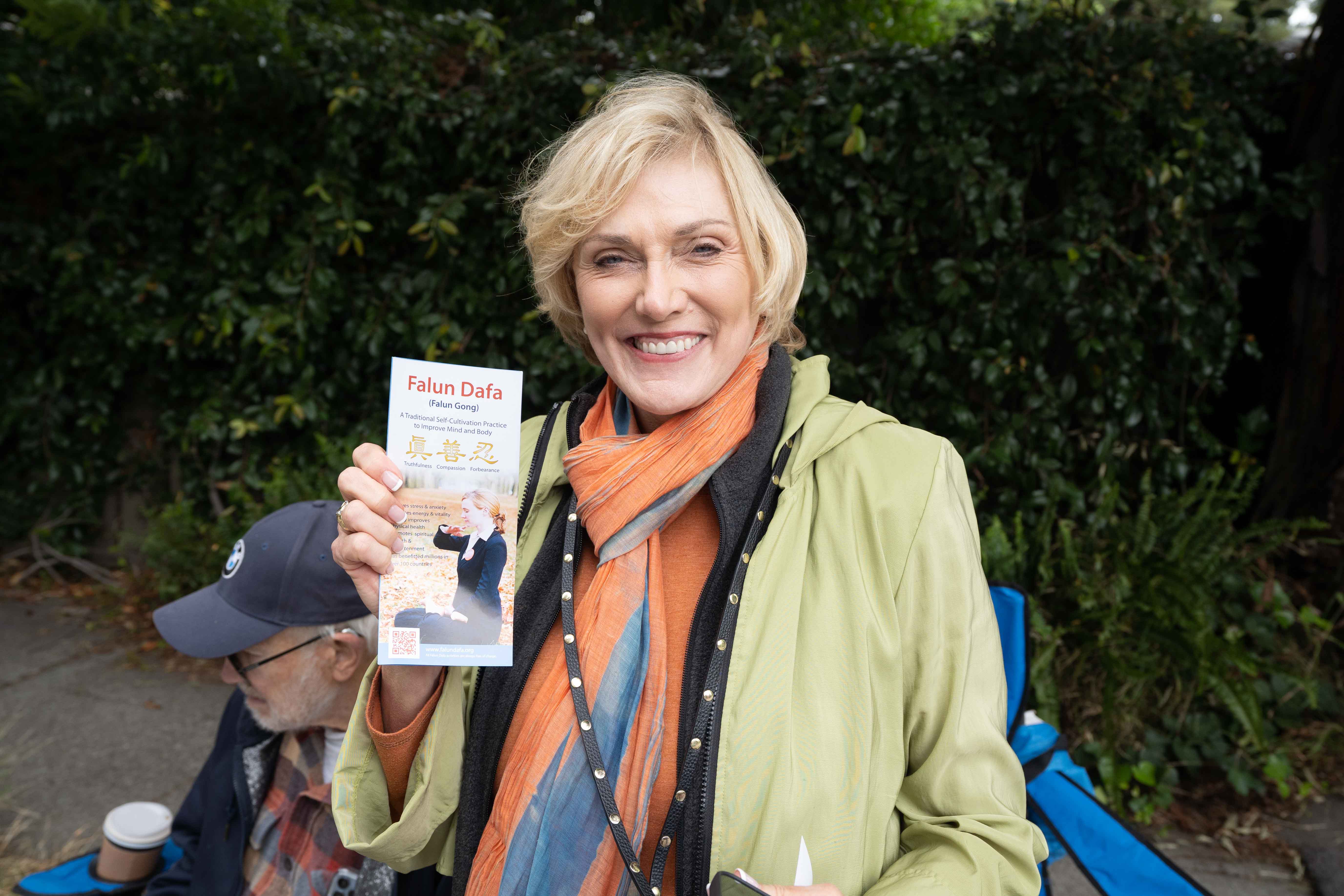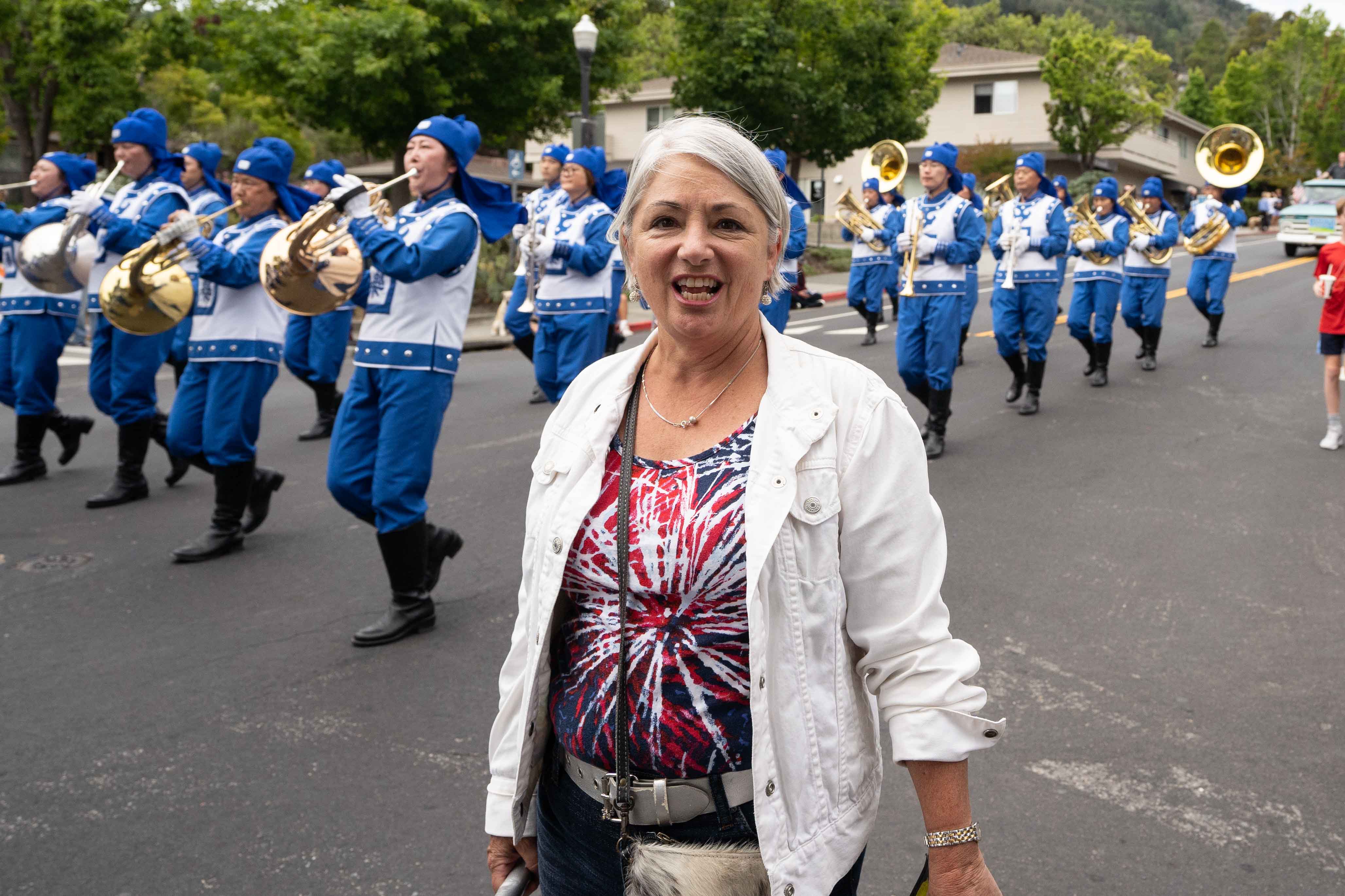 Jennifer女士在法轮功学员的队伍经过时,高兴地鼓掌,她说,“他们的演奏太美了,他们都非常喜爱,我已经收到你们的小册子了,我喜欢法轮功的真善忍原则,这个原则对我来说太重要了。谢谢你们今天来这里。”