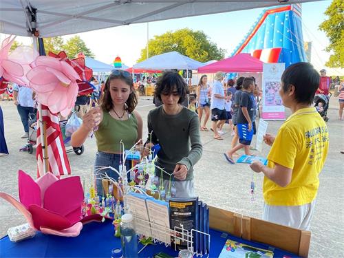 中国大陆来的一家三代四口人在法轮功的展位前停下来,二个女孩高兴地接过学员送过的小莲花,母亲和奶奶接过法轮功传单和明慧网的《天地苍生》杂志。