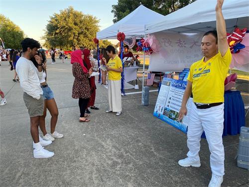 【明慧网二零二二年七月六日】(明慧记者曾洪达拉斯报道)二零二二年七月四日晚上六点至十点,美国德克萨斯州达拉斯地区的法轮功学员参加了布兰诺市“所有美国人的四日”(Plano's All American's 4th)观看焰火活动,向人们介绍法轮大法,传真相、送福音。