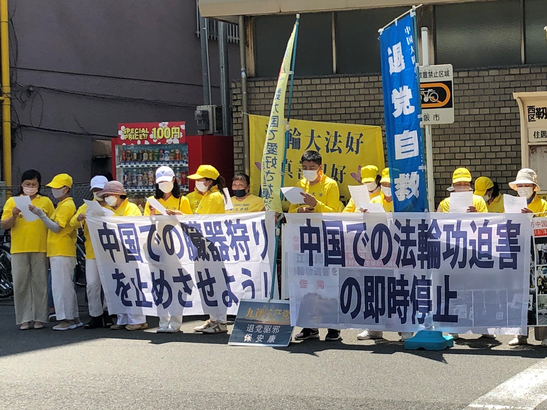 每年七月二十日,海外的法轮功学员除了举行大型的游行集会、烛光悼念等活动之外,也都会在中国(中共)驻海外领事馆、大使馆前和平抗议,日本关西地区也不例外,广泛的向大众传递法轮功真相并揭露大陆法轮功学员被迫害的现状,希望能够唤醒更多的人认清中共。