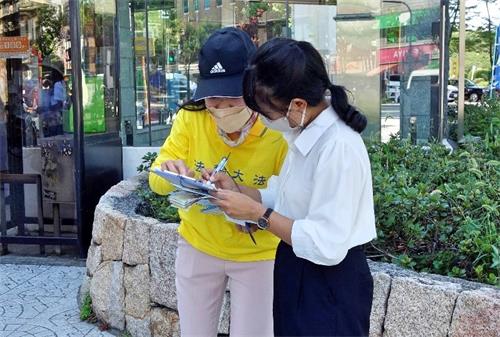 两位女中学生接过真相资料,并听学员讲解后表示,初次得知在中国发生的对法轮功的迫害及活摘器官的事情,感到无法相信。两人都签了名,并希望早日结束这场迫害。