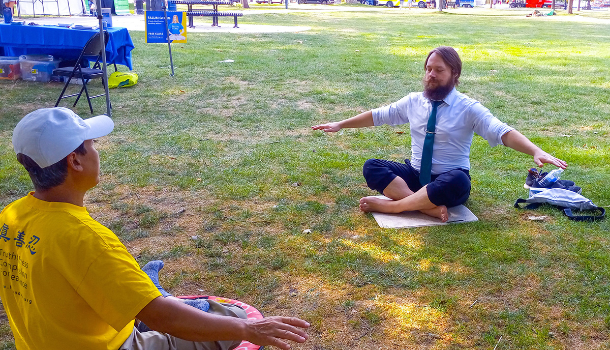 当地居民布兰登先生,他在现场学炼了全部五套功法。他表示炼功时的感受非常美好,能够明显地感到身体在改变,全身的肌肉好像被启动了一样,非常舒服。他计划到大法网站观看教功视频,进一步了解法轮功。他说今天是他有生以来第一次听到 Compassion(善)和 Tolerance(忍)。他认为法轮大法的真、善、忍能够帮助人们成为更好的人。