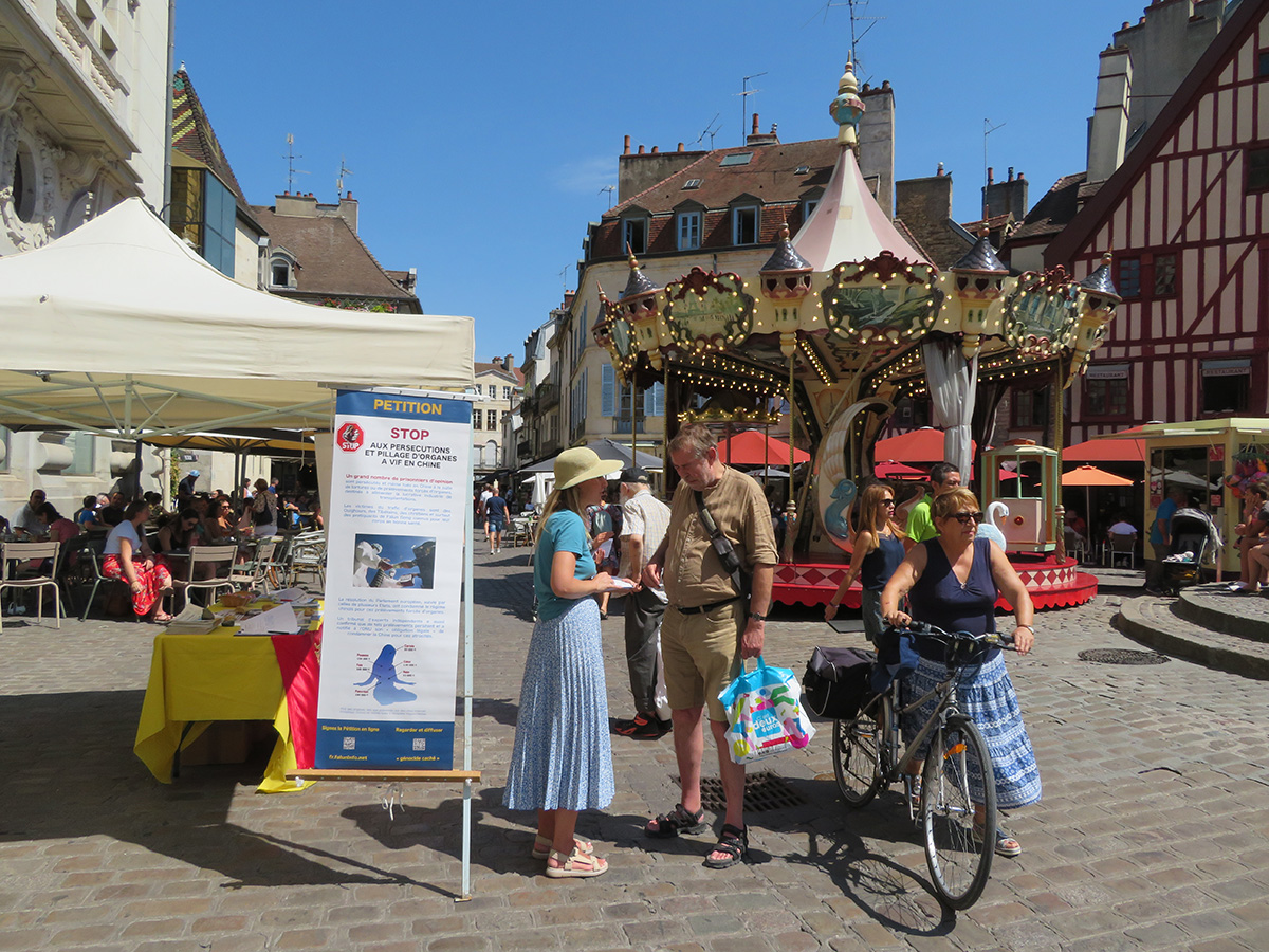 二零二二年八月六日,在第戎市中心弗朗索瓦·汝德广场(Place François Rude),法轮功学员进行了讲真相和征签的活动。