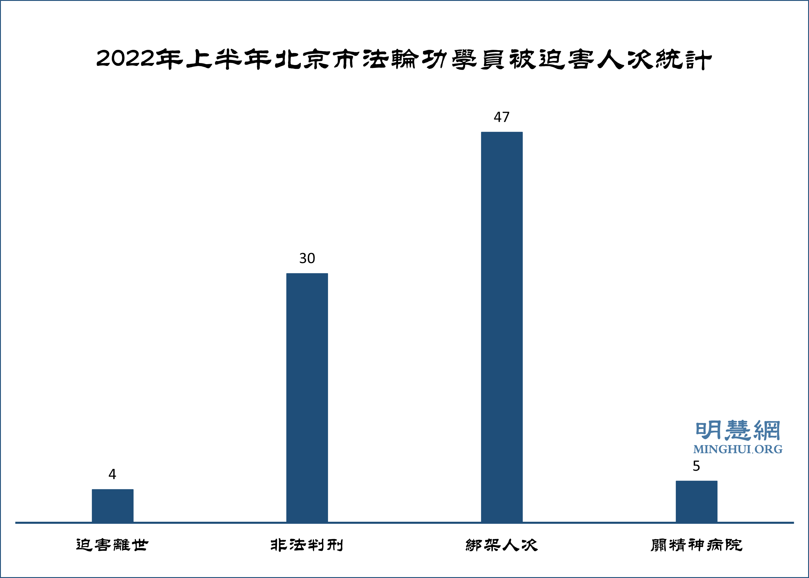 根据明慧网报导统计,二零二二年上半年获知北京地区法轮功学员被非法判刑的人数又有30人,被绑架有姓名者至少47人。