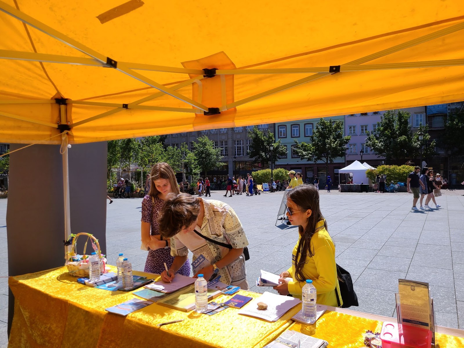 法轮大法学员在该广场上设立了两个相对的展台和醒目的大横幅。吸引了许多当地民众和游客驻足观看、了解真相。许多路人被克莱伯广场中心的“反种族灭绝”的横幅所吸引。他们主动上前找参加活动的法轮功学员交谈,并积极签署请愿书。许多人索要资料并与朋友分享。他们甚至主动帮忙招呼路人来关注该活动。当人们得知是中共犯下的隐秘的种族灭绝罪后,都愿意在请愿书上签字。