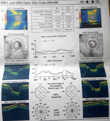 二零一二年四月,洪洪告诉我,他坐在第一排都看不见黑板上的字。于是五月份,我们再次来到华西医院进行检查。医生告诉我:“你家小孩的眼睛验光,300度也只能看到0.8,200度也是0.8,度数上不去。你带他做一个全面的检查。”下面这些就是当时做眼部OCT时照出来的图片: