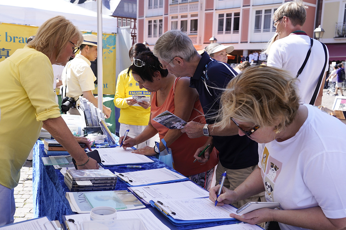 黑森州州议会副主席卡琳·穆勒(Karin Müller)发支持信,祝法轮功学员当天活动顺利、成功。多年来她一直在关注并支持法轮功学员反迫害,这次她表示:“我希望法轮功学员们一如既往地保持他们的勇气和力量。”