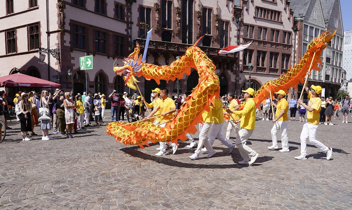 【明慧网二零二二年八月十六日】二零二二年八月十三日,法轮功学员聚集在德国金融中心法兰克福罗马广场(Römerberg),举办大型活动庆祝四亿中国人抛弃中共,获得新生。当天活动内容丰富多彩,包括集会演讲、舞龙表演、腰鼓队表演和法轮功功法展示。在集会现场,当地法轮功学员们发放传单,向各国游客和当地市民介绍本次退党活动,并征集反迫害签名等。