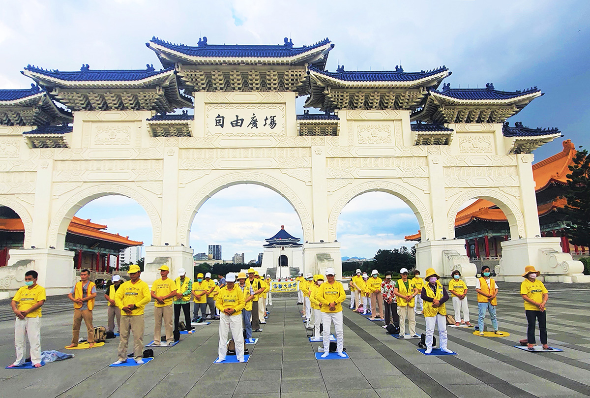 近日台北一连多天出现酷暑高温的气候,随着悠扬的炼功音乐响起,法轮功学员演炼着缓、慢、圆的五套功法,天气不再酷热,自由广场上显得静谧祥和。