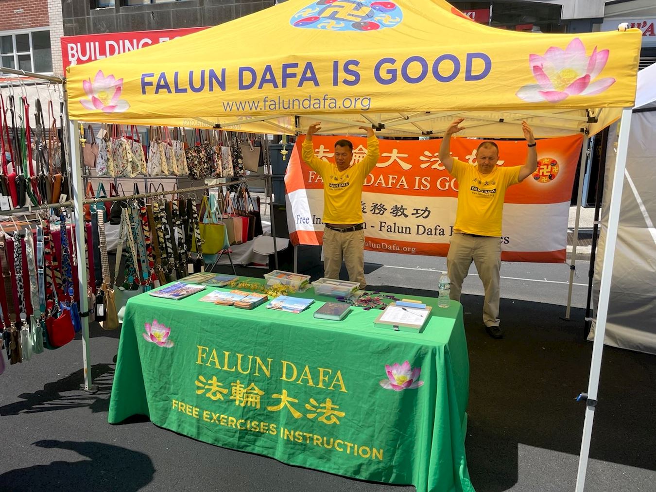 巴特里西奥(Batricio)和他的朋友在街头集市上漫步,玩得很开心。他们来到学员的摊位,停下来听学员讲解法轮大法功法。西人大法弟子详细的介绍了法轮大法,还有一些纽约市民通过大法弟子的介绍,很感兴趣,留下了自己的联系信箱,希望以后进一步了解大法。
