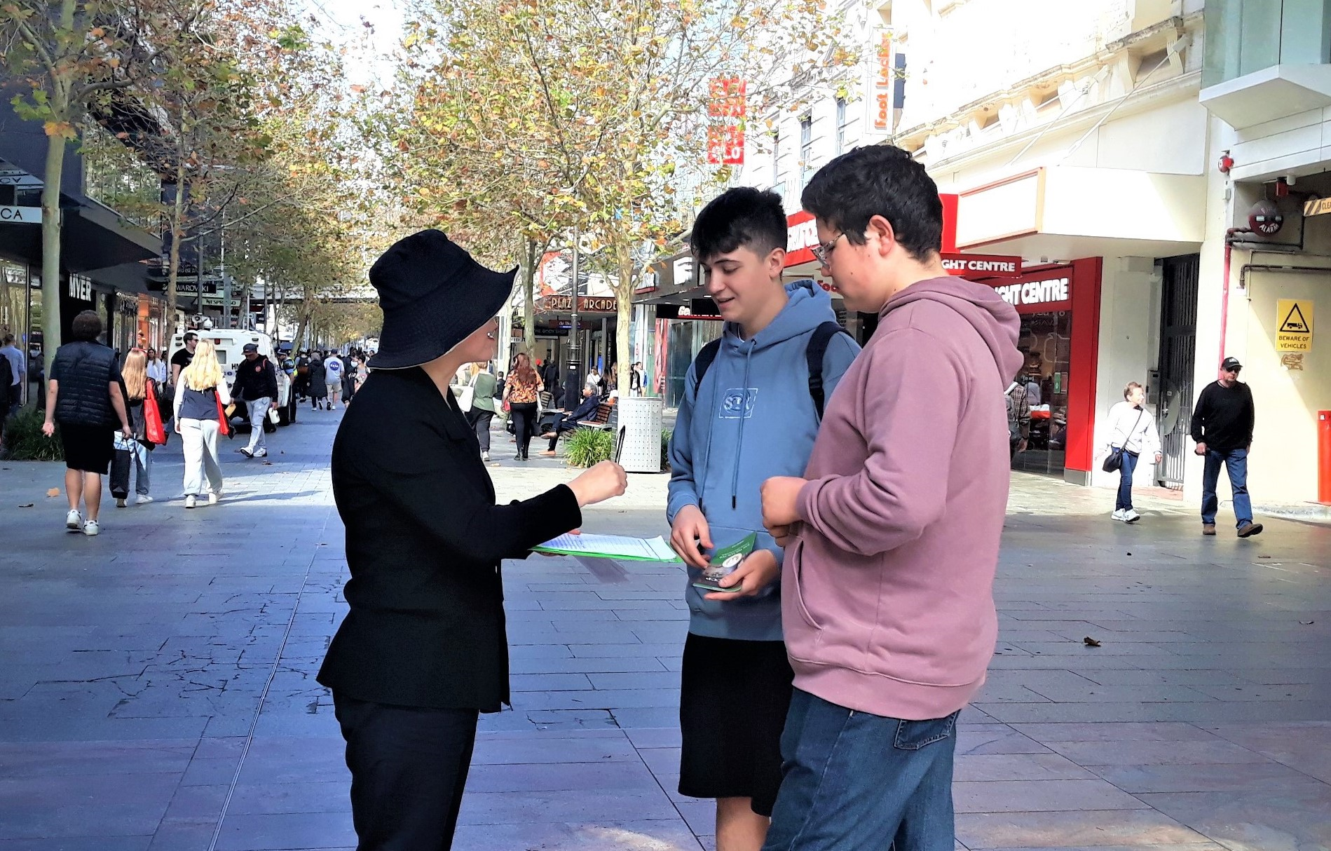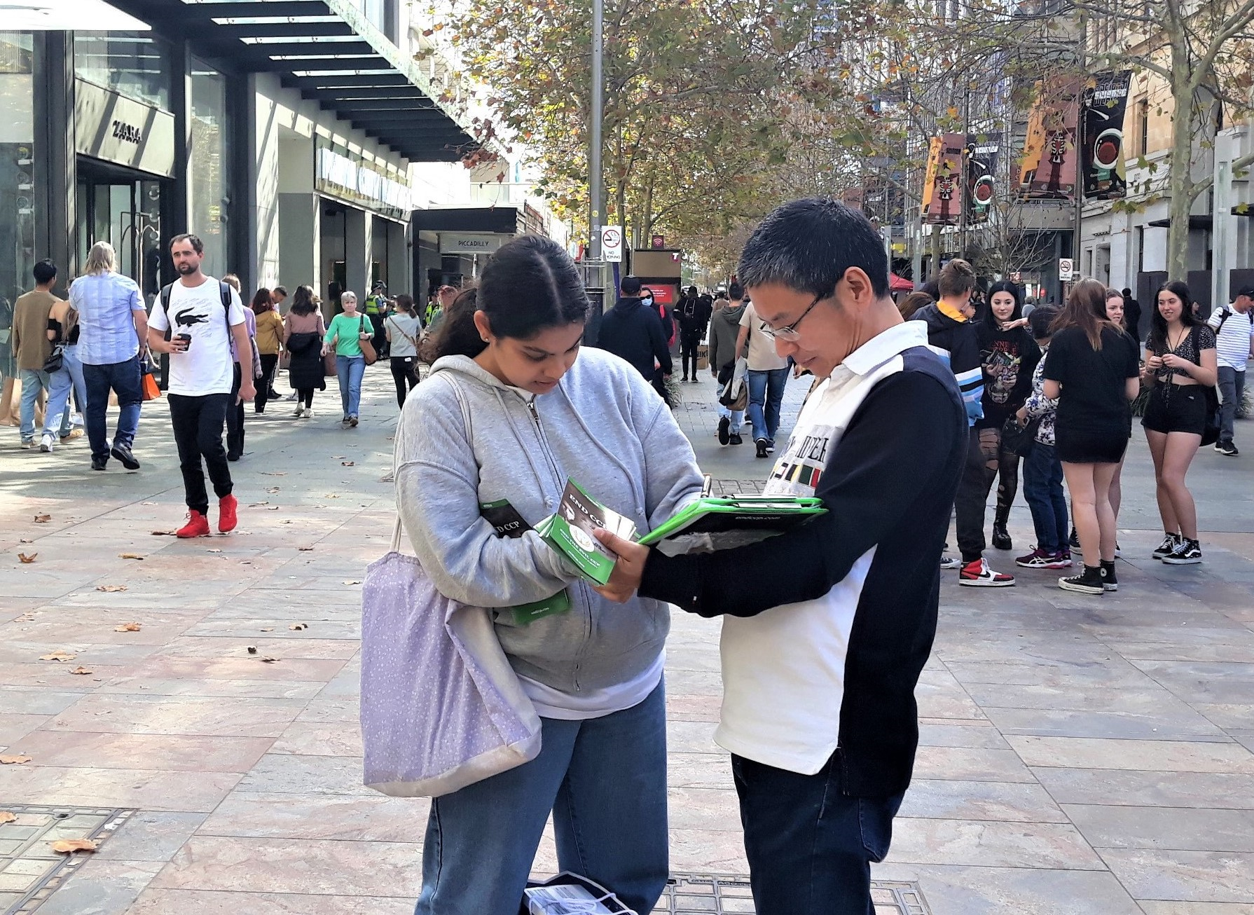 【明慧网二零二二年八月二十五日】(明慧澳洲珀斯记者站报道)二零二二年八月二十一日,西澳珀斯法轮功学员在市中心步行街上举行集会,庆祝在全球退党中心网站上退出中共党、团、队(三退)的人数超过四亿。数位社会精英人士到场支持发言。