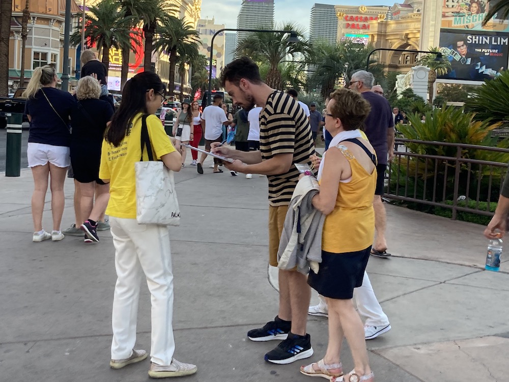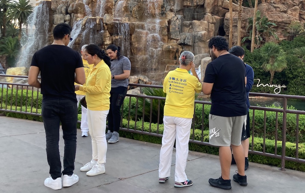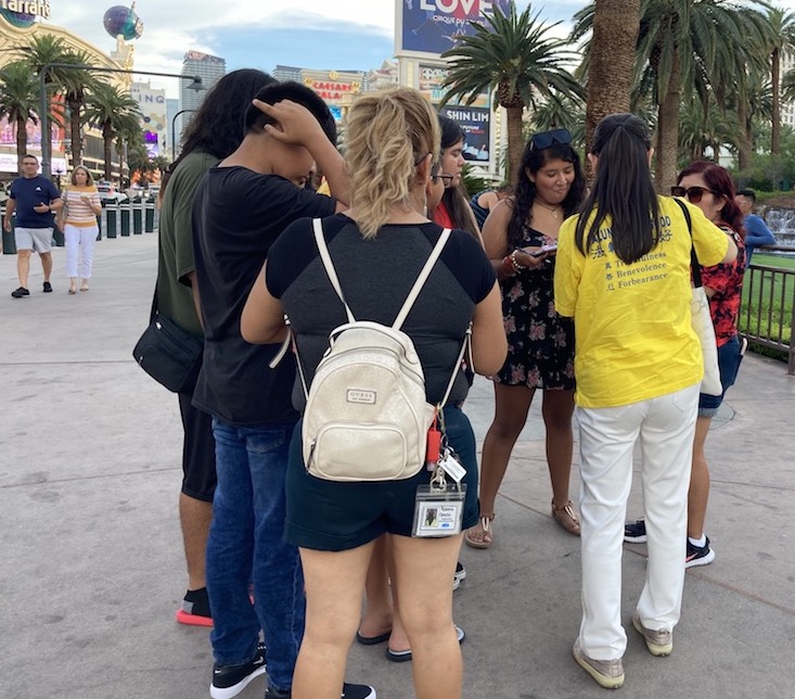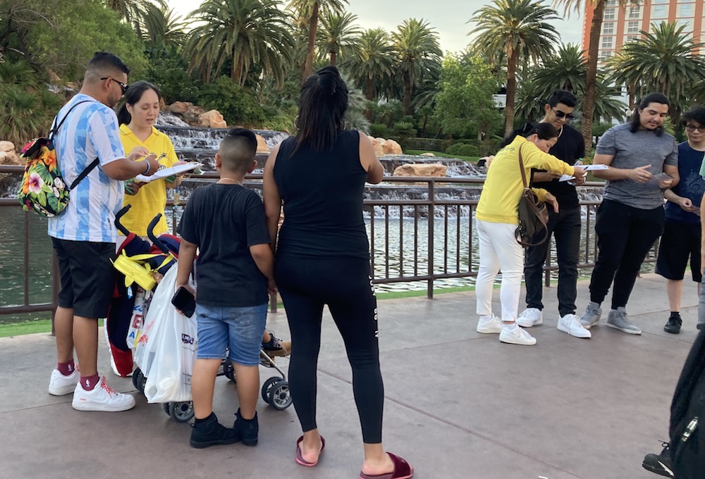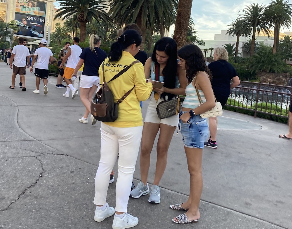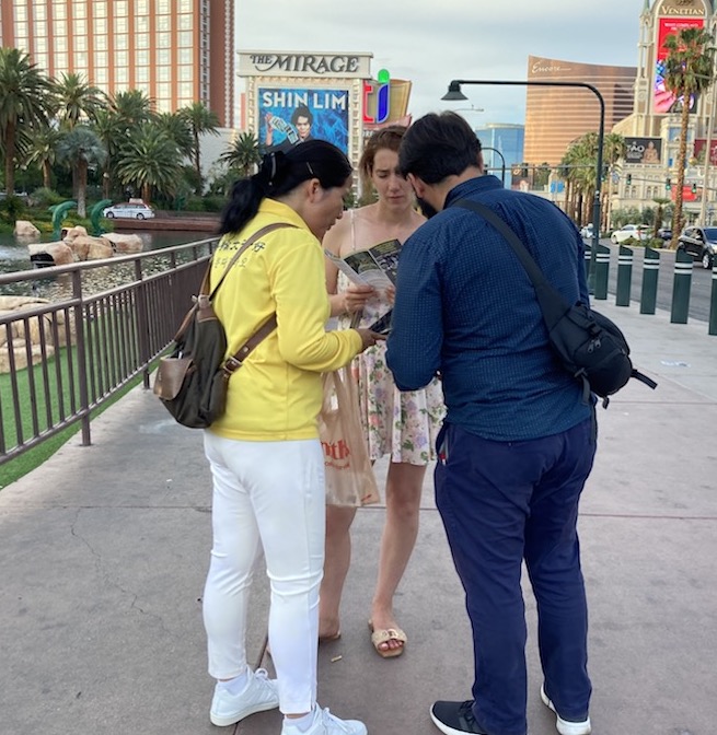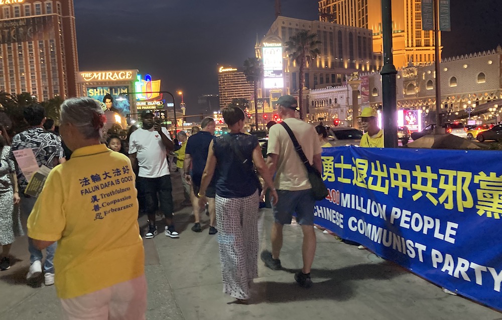 为庆祝这历史时刻,拉斯维加斯法轮功学员在景点,面对人来人往的游客,打开写有中英文横幅“声援四亿勇士退出中共邪党”。
