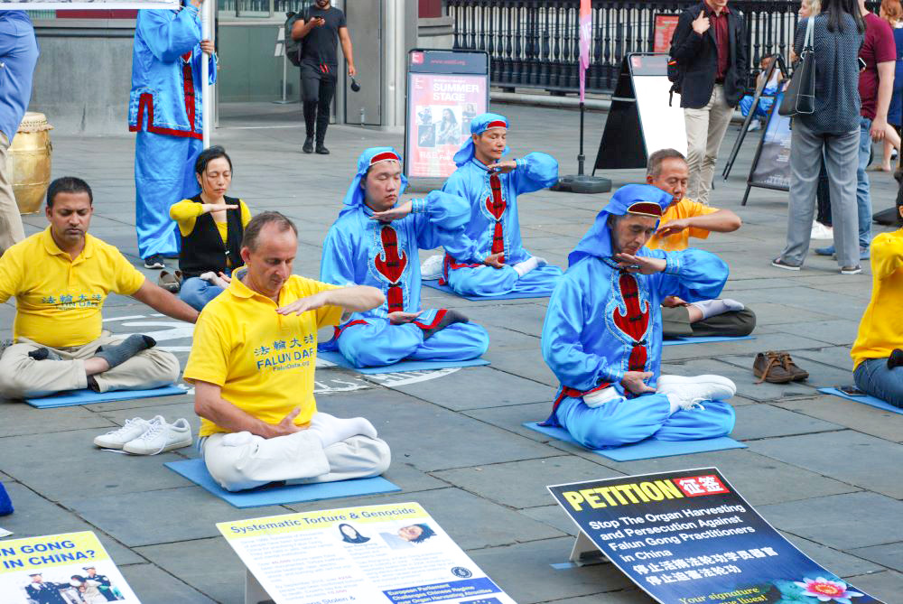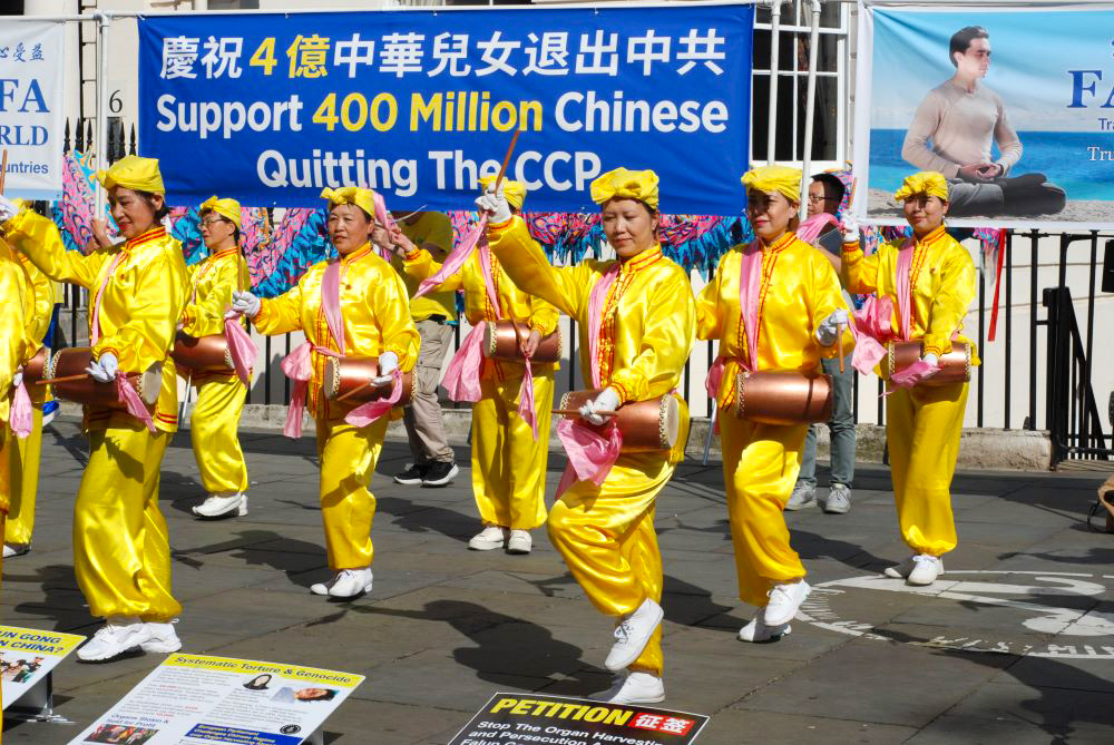 学员们在圣马丁广场展示了多面横幅,向民众传达活动的重要信息。并有腰鼓队、舞龙队的表演,和法轮功的功法展示,庆祝四亿中国人从心灵上抛弃中共,摆脱枷锁,拥抱自由新生!